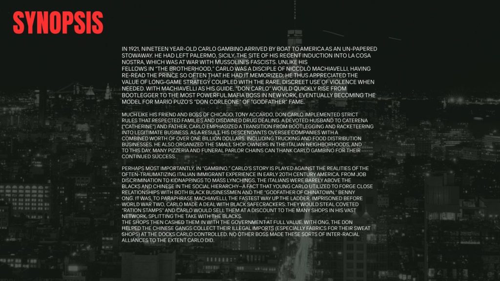 A journalist investigates Carlo Gambino’s legacy after his death, exploring how this Sicilian butcher’s son became NYC’s quiet but ruthless crime boss, through accounts of those who knew him.